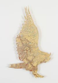 Claire Brewster makes delicate, intricate paper cut-outs of birds and plants from vintage materials. “Are You Going My Way (Great Horned Owl)” was cut out of a vintage map of land classification and density of standing timber in the Bald Mountain Quadrangle.